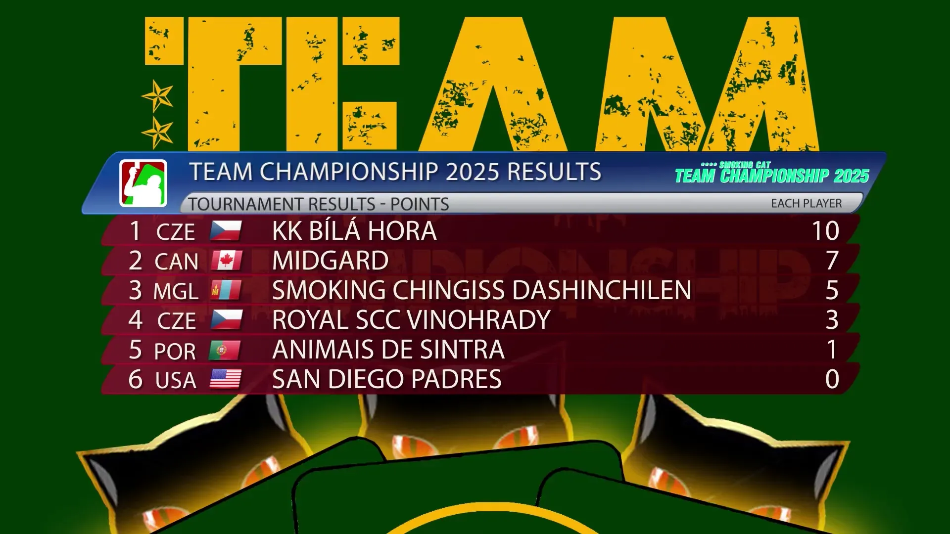 Jedná se o šestý titul pro český tým v řadě. Za vítěznými Kákáčky skončil stříbrný Midgard a bronz vybojoval mongolský Dashinchilen.